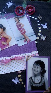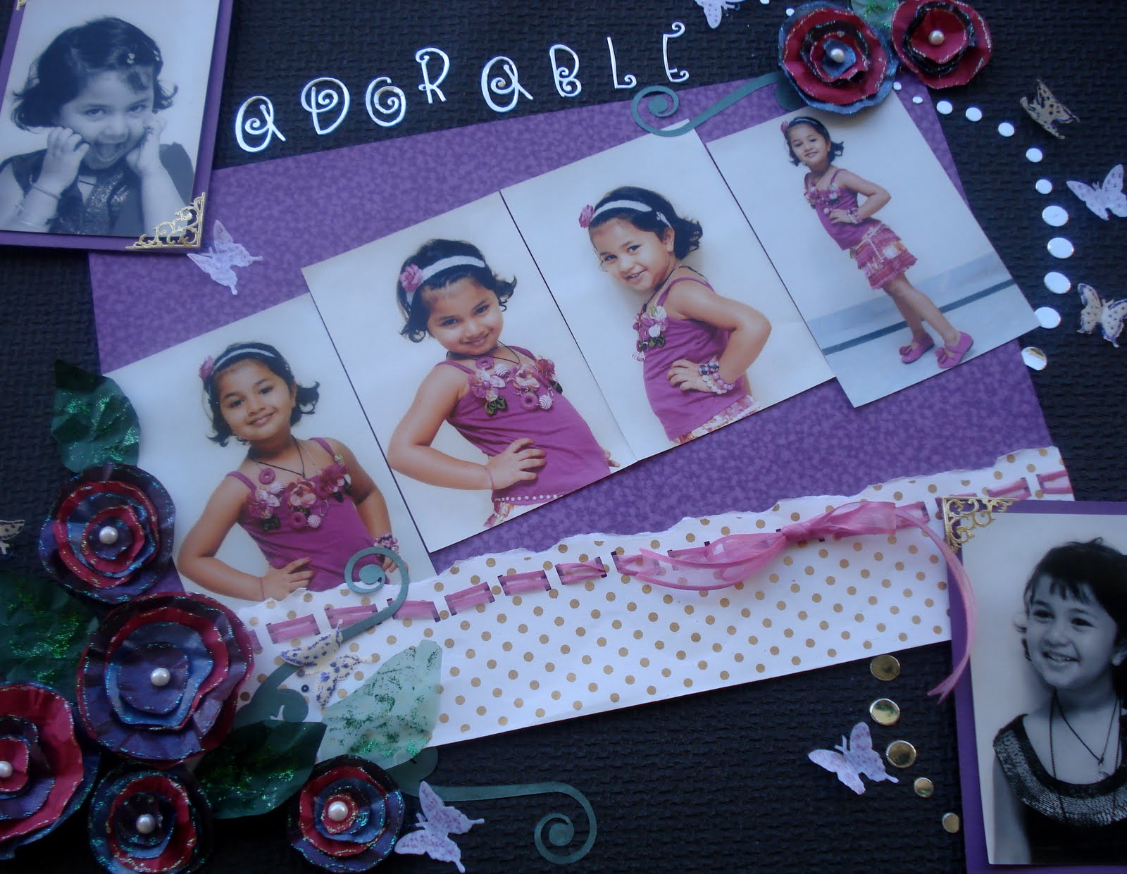 Since the pics were in deep pink I used purple (incidentally that’s her room color)to highlight the pictures.The gold dotted paper has been randomly torn n punched with a thread puncher to pass the pink organza tissue ribbon.