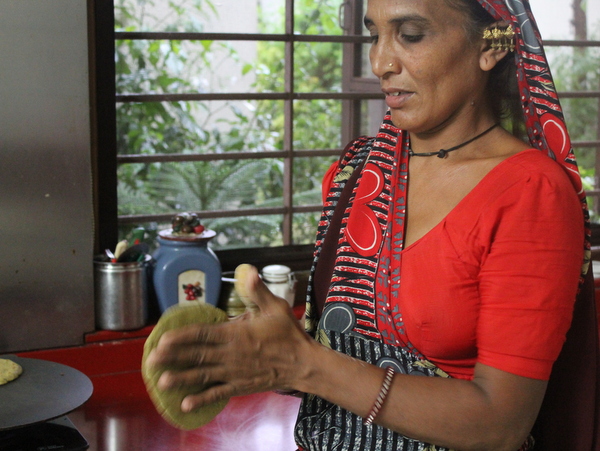 For this month’s Indian Cooking Chalenge, Srivalli gave us the choice to prepare from two diferent Indian breads.I loved both the recipes , these are from Tarla Dalal and Sanjeev Kapoor’s cook books and I am an ardent fan of both.Incidentally we make lot of Bajra rotis in winter and rainy season.These are very popular in Gujarat and one must remember that if the millet is not freshly milled, it shall give you a bitter after taste.My part time maid is from a rabari community and these people survive on Bajri Rotlas. Rotlas are a thicker and a bigger version of roti About 250 gms of flour is used to make one rotla.The dough for each rotla is binded separately, for the second rotla you have to bind the dough fresh and all over again .These are made by clapping lightly with palms and with the finger tips. Normally made on a coal sigri and a clay gridle  these taste wonderful. For this post I asked my maid to make the authentic way, I just changed the size.