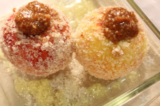 Roll the apples in melted butter,then in bread crumbs and finally sugar.