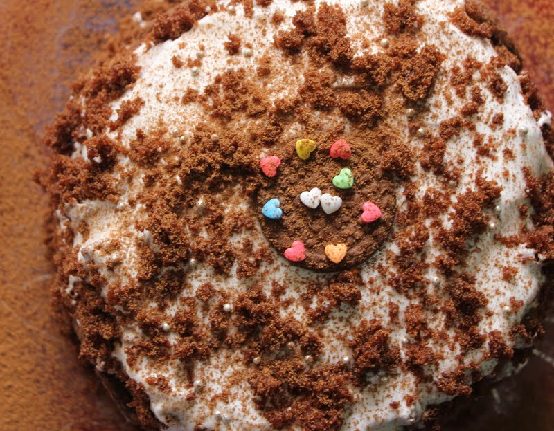 Sprinkle some crumbled cake on top too.finishing up with some biscuits ,silver balls and tiny hearts!!