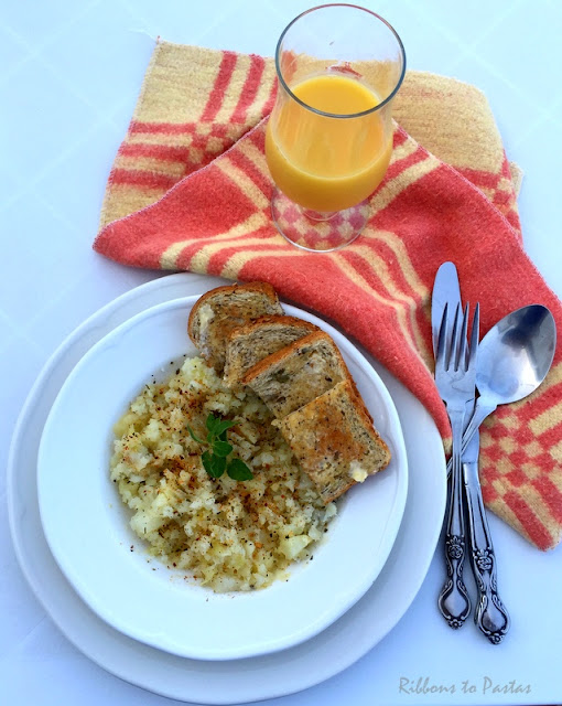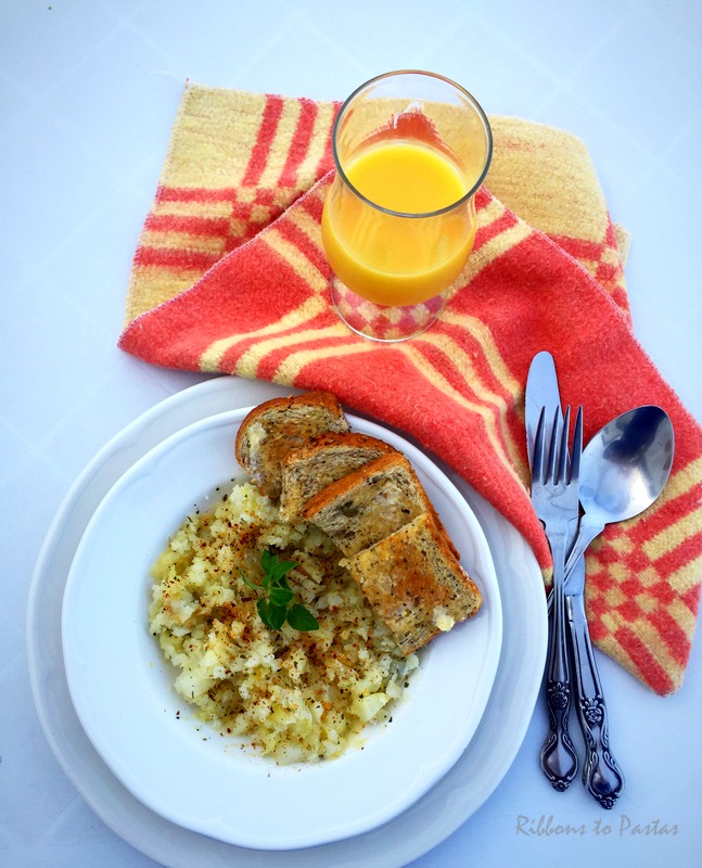 Yesterday it was Pizza on a Bun which I cooked for myself while I was on a holiday to Tenerife, today I have yet another meal that I made for myself. Tenerife is popular for its production of bananas, while driving from the airport to the hotel we could see just bananas and banana. A fruit that I don’t like, and is a must breakfast for my hubby. So while we were there my hubby did not want any other breakfast except bananas. I always prefer something savoury and normally have a sandwich. You guys know my love for sandwiches, right ? Anything with bread is fine, so one of the days I made some mashed potatoes with some butter . I seasoned the potatoes with a special spice from the island. A toast and some orange juice made a perfect breakfast. So here is my breakfast which was simply awesome and the aroma of the spices along with butter tempted hubby to try some.