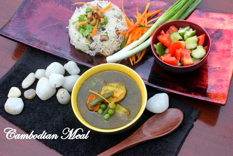 The staple food for Cambodians is rice. It is consumed by most Cambodians daily and with all meals, using a great number of cooking styles and techniques. There are hundreds of varieties of indigenous Khmer rice, from the fragrant jasmine rice to countless types of wild, brown and sticky rice . Rice, in Cambodia is eaten all day long in the form of street-side snacks, but for today I have cooked a rice variety that the Cambodians eat on New Year for good luck. This tasty  coconut rice bean is a very popular dish with Khmer Krom vegetarians. Fragrant rice and the black eyed peas, simmered and cooked in creamy coconut milk, tastes absolutely divine. The use of lime leaves will surely lend it a amazing flavor, since I did not get these leaves, I used lemon grass. We simply loved these .  I served Solar Kari Sap, which is a Cambodian curry  along with these creamy rice. I also served a Cambodian relish with this meal.The relish sure has a fancy name Chorus Trosot Pingpot.