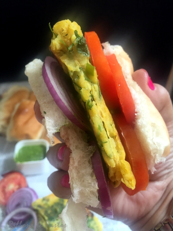 Next in the Pav Sandwich series is Cheela Pav. The Besan Cheelas taste amazing on their own and in Sindhi families they are a big hit for breakfast. They eat these cheelas with bread or even chapati. I worked on the same concept and sandwiched the cheela in a Pav. A spicy green chutney, some onion rings and tomato slices complete the sandwich, oh yes a dash of Chaat masala. I bet your mouth’s watering !