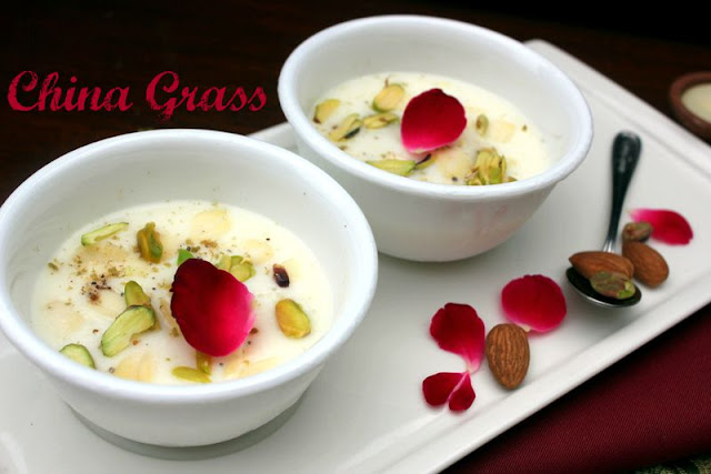 Agar agar is a natural sea weed and is supposed to be really healthy. It is very popular in Asian countries and is used in different kinds of desserts. It is a wonderful substitute for gelatine. I have made pannacottas with this agar agar ,salads too but my hubby likes it in this simple form. I would love to make more bowls but unfortunately no one in the house wants to eat it..now aren’t you wondering why ? Well hubby does not want any sugar or sugar substitute in the dessert. Secondly since this is always in the frig everyone finds it boring. The day I feel like eating I add sugar to my bowl or make a caramel pudding from it. It is delicious and healthy if made with the given recipe , please add sugar 😉