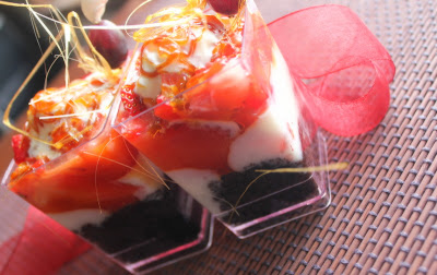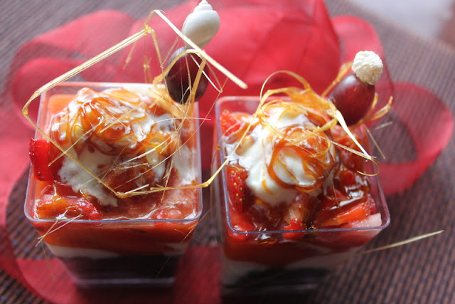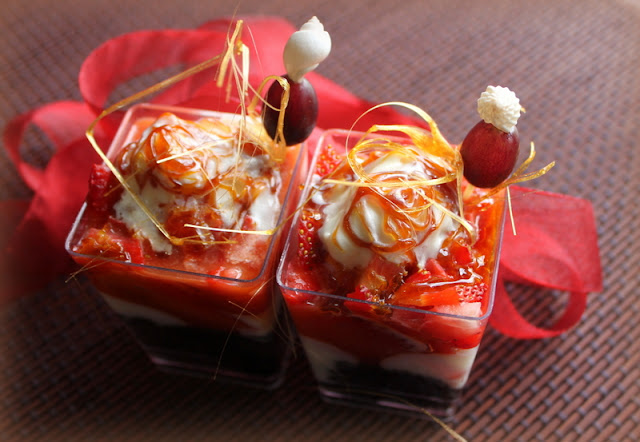 The Strawberries are still in season, well even if they are not, just dig out the frozen ones. The dessert is nice and chilled and absolutely appropriate for those summer evenings.Here is a simple dessert that you can whip up in a jiffy, if you have the cake ready.Well, you could even substitute the cake with crumbled chocolate biscuits!