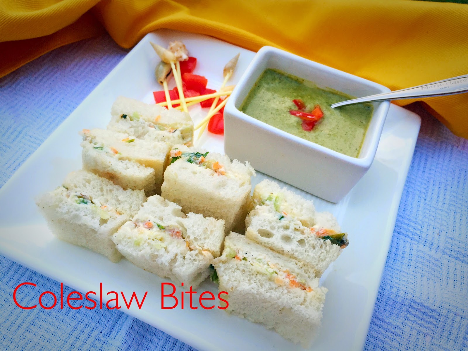 I am a hard core fan of bread and love it in any form. I love sandwiches and try to make them in different variations. These coleslaw sandwiches have been a great hit with my guests, and if you cut them further they become bites. They look colorful and taste delicious plus are healthy. Of course you could substitute white bread with brown. For a more dramatic affair. Use both the breads, brown and white.