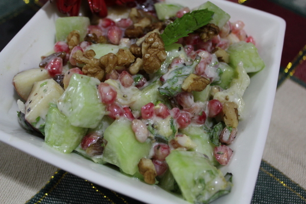 Add chopped cubed, apples and cucumbers along with ½ tsp lemon juice.