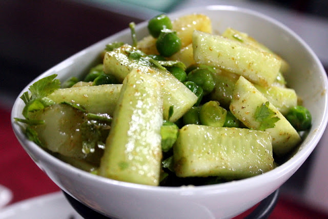 I love making salads and we all enjoy them . At times salads are our dinner , though most of the times they are served before the meals. Since cucumbers are full of water , I love using them in my salads. The cucumbers along with potatoes and peas tastes really awesome. The spices in this salad are on the medium side. If you do not get yellow chilly powder, you could use red chilly powder. The winter peas taste delicious and sweet, so even if the salad is spicy, it gets balanced with fresh peas. This definitely is a very simple salad but trust me you can finish a big bowl of it without feeling guilty.