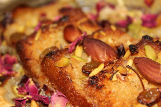 I am an ardent lover of Shahi Tukde,but Double Ka Meetha ..this was my first trial and it turned out absolutely gorgeous.Here I will not forget to thank Mona of Zaiqa.I tweaked her recipe..we can serve it hot,warm or chilled.I served it warm but one can serve according to the season.In winters you could serve it piping hot from the oven ,may be with ice cream.You could even serve it for breakfast when you have some special guests coming in.Today being the last day of this BM I wanted to end up with a sweet note and so here is….Double Ka Meetha……