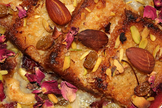 The Nizami kitchen of Hyderabad had some delicious rich desserts.Among these Double Ka Meetha is the king of desserts.One could say a version of Shahi Tukde,which is Awadi.The name Double comes from the bread dough which rises to the double…and roti is a variety of Indian bread…so double roti..and meetha of course is sweet ..so ..double ka meetha.
