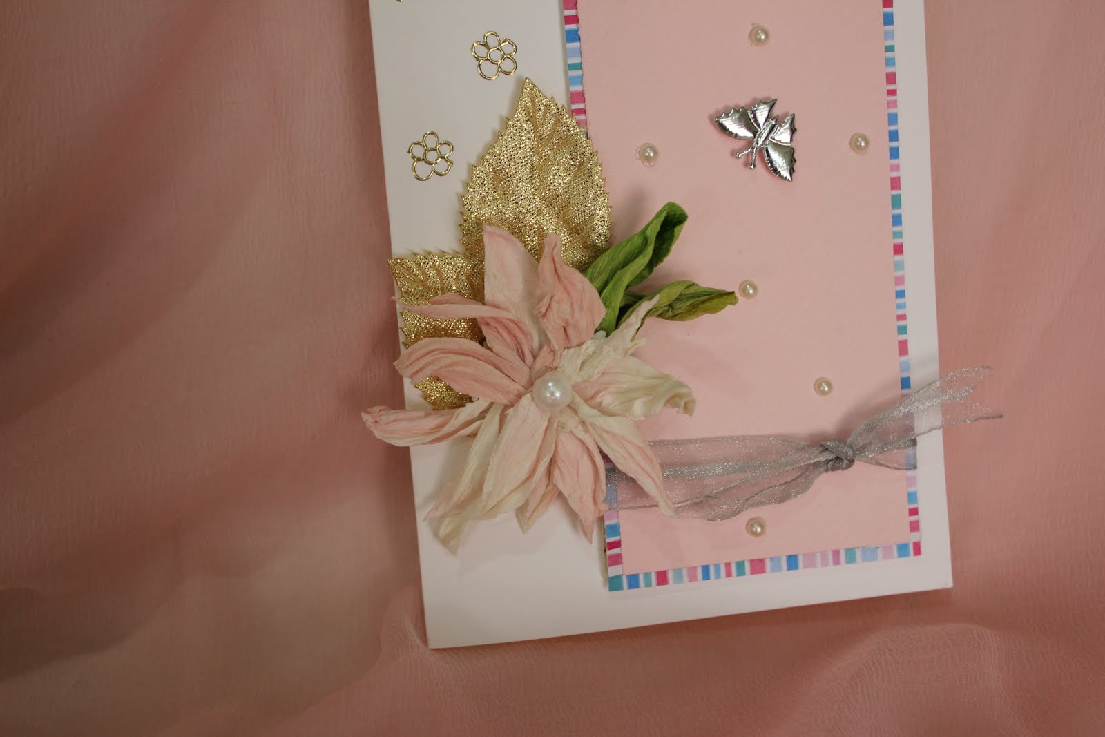 I used white cardstock for the card, pastel pink textured paper highlighting it.I edged this with brightly striped paper which I downloaded from a backing paper site.For embllishments I used tiny pearls, butterflies, some dainty gold flowers and a silver sheened organza ribbon.oh yes..coming to the second part of the challenge hand made embllishment….”duplex paper flower centred with a pearl”.