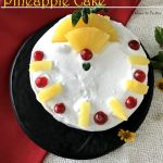 Eggless Pineapple Cake is a soft , delicious pineapple flavored cake frosted with fresh cream and filled with pineapple pieces and cream .The cake is a classic cake and looks very attractive with cherries .