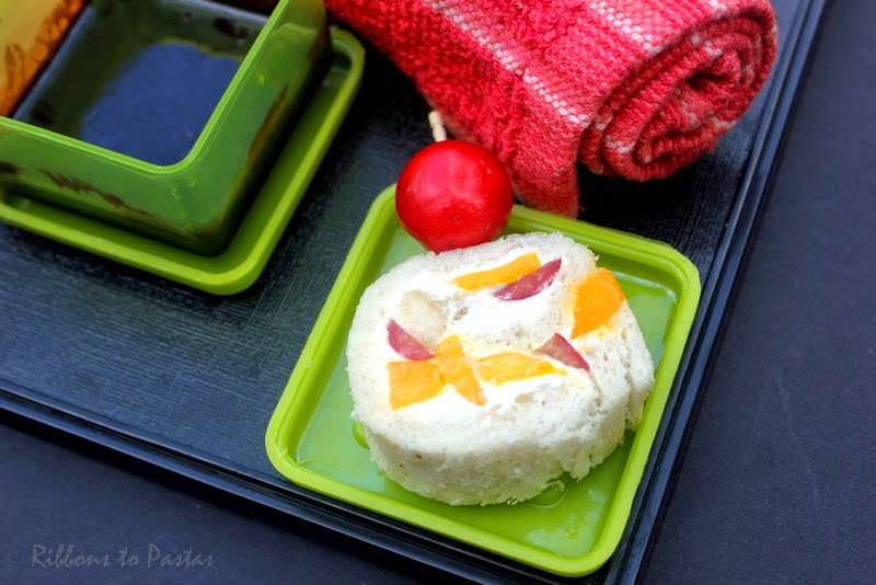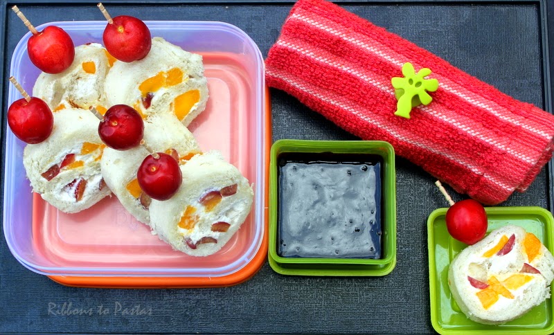 Holidays are so much fun and they leave back some beautiful memories. This fruit cream sandwich immediately takes me back to Japan. While on my trip there my neice got amazing sandwiches from a place called Sandwich Factory.There were three four types but this cream one was the best and ever since I have thinking of trying and giving the sandwich a new avataar. So while working on my snack box theme for the 3rd day of the third week I made these pinwheel sandwiches filled with fresh whipped cream mango , banana and cherry.I packed these with a dipping sauce…and what better than chocolate ganache!