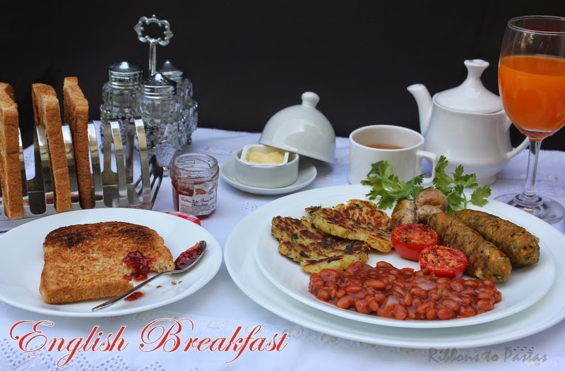 Breakfast may begin with orange juice, but the heart of the Full breakfast is bacon and eggs. They are variously accompanied by baked beans, sausages, grilled tomato, mushrooms, tea, toast and marmalade. Well since I was doing a vegetarian breakfast, I made some vegetarian sausages, bacon and eggs obviously were out of question. I also served some hash brown, which are so very British!