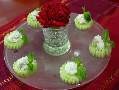 I have scooped a unpeeled cucumber at regular intervals.filled cheese, garnished with olives and filled ketchup.