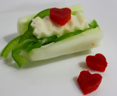 The first boat has been filled with capsicum salad and cottage cheese with tiny capsicum hearts.
