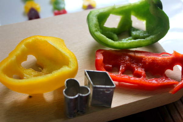 I used the three different colors of bell pepper, but for spade I used blanched beet root.