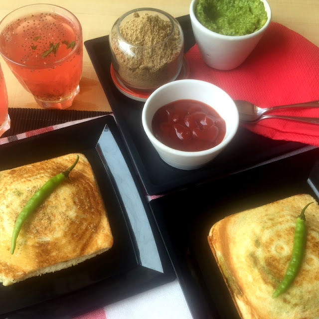 The combination of butter, potato , tomato and cheese is a combination which never fails. The Mumbai sandwich vendors have a beautiful knack to use these combinations. This particular sandwich is quite different, where the potato is roasted on the griddle and then rest of the ingredients like cheese, tomato are added. Since the potato is roasted , and is hot the tomato cooks well inside and the juice spreads giving a awesome flavor . The cheese too melts beautifully. The sandwich masala gives it the Mumbai touch.