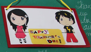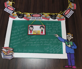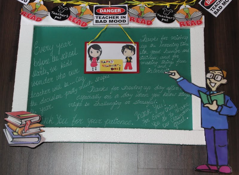 So we chose a green paper ..just the right color of today’s black boards….gave it a thermocol frame and wrote with white pen .Rest of the job is with printouts…The standing teacher has a thermocol back to give it a dimension .The centre of the board is highlighted with two students holding a banner…Happy Teacher’s Day.