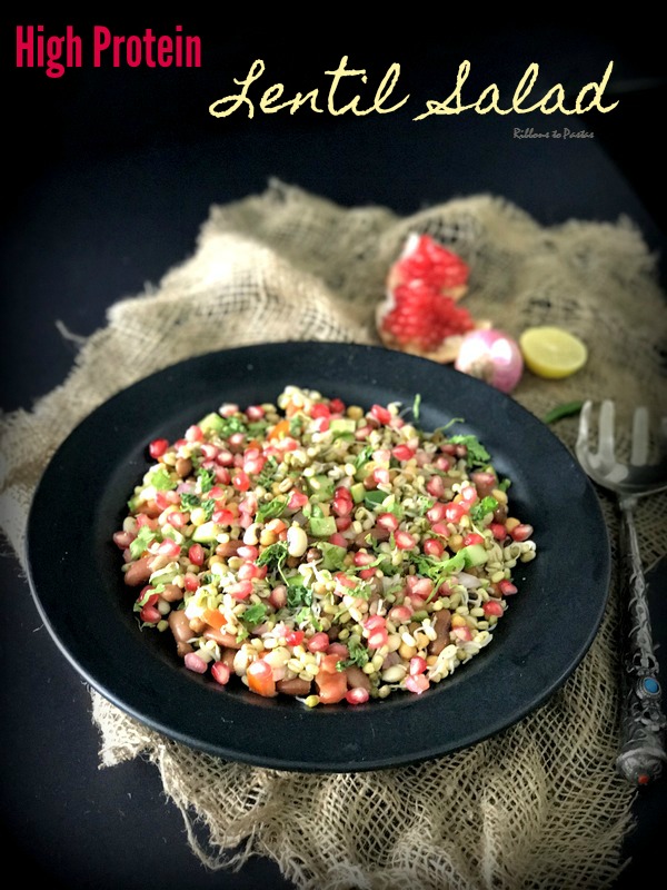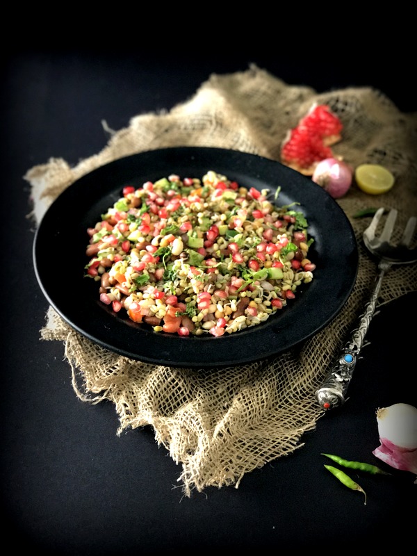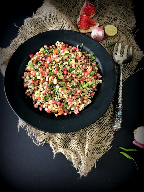 The salad has chickpeas , kidney beans , black eyed beans , sprouted moong beans , all these lentils are full of protein . I added onion, cucumber ,tomato and pomegranate for crunch . Coriander and mint make excellent herbs for this salad . A dash of yellow chilly powder and some spicy finely cut green chilly add on to the zing . One can add some tamarind juice or lemon juice , both compliment the salad .