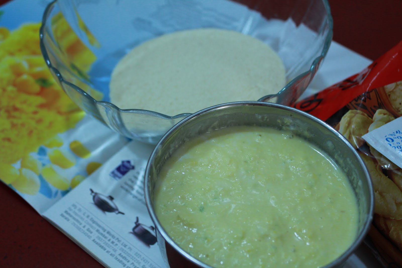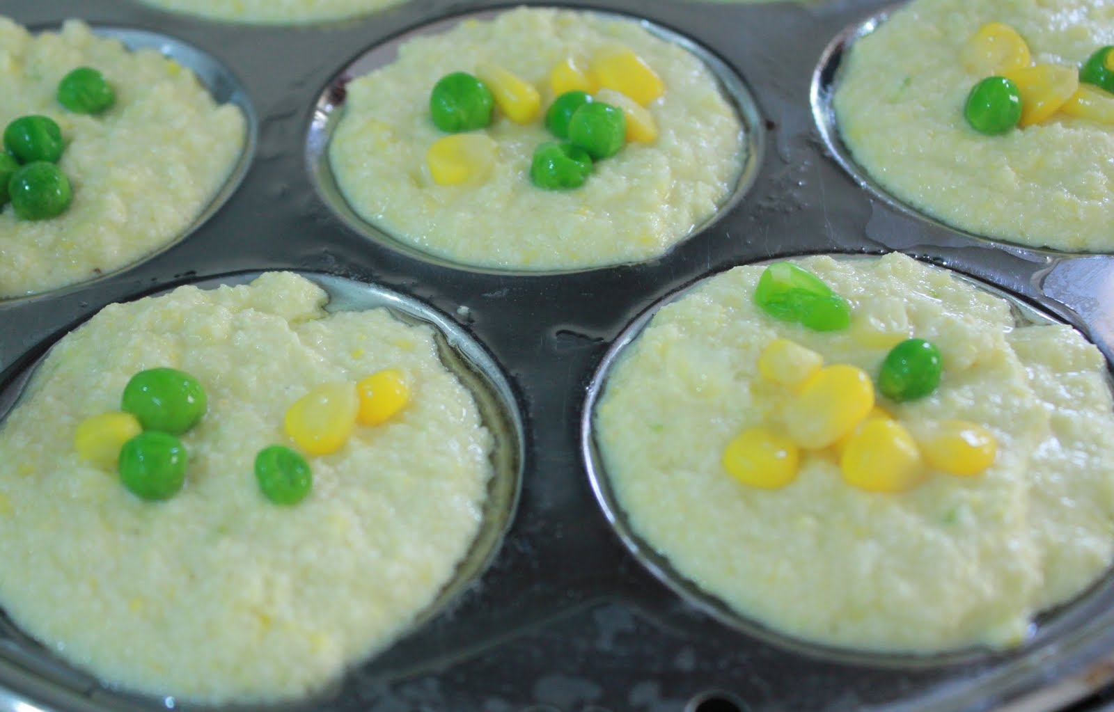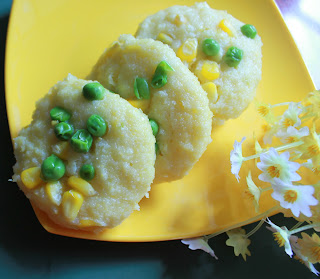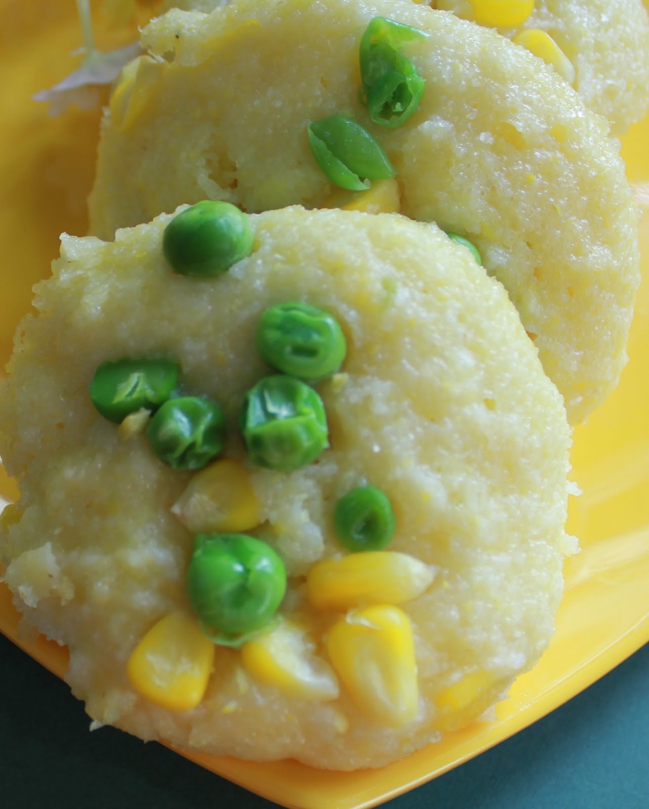 I am always on a lookout to try steamed and low cal recipes,while going through the ‘march-april’2011 issue of ‘Cooking &more’ spotted instant corn dhoklas,tried them instantly.I did not make any changes in the recipe except that I steamed them in idli moulds instead of muffin moulds n garnished them with frozen peas n corn.