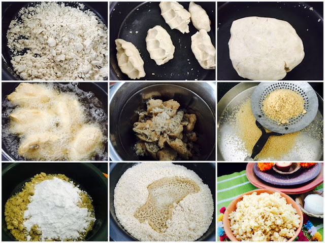 The Kutti is made like the Choorma . After adding ghee to the Joovar flour, its binded and then big oblong rolls are made, these are then deep fried on slow flame till golden. After they cool down, these are broken into pieces and blended to get a grainy texture. Powdered sugar and ghee is added to finish the Kutti. Coming to the recipe…