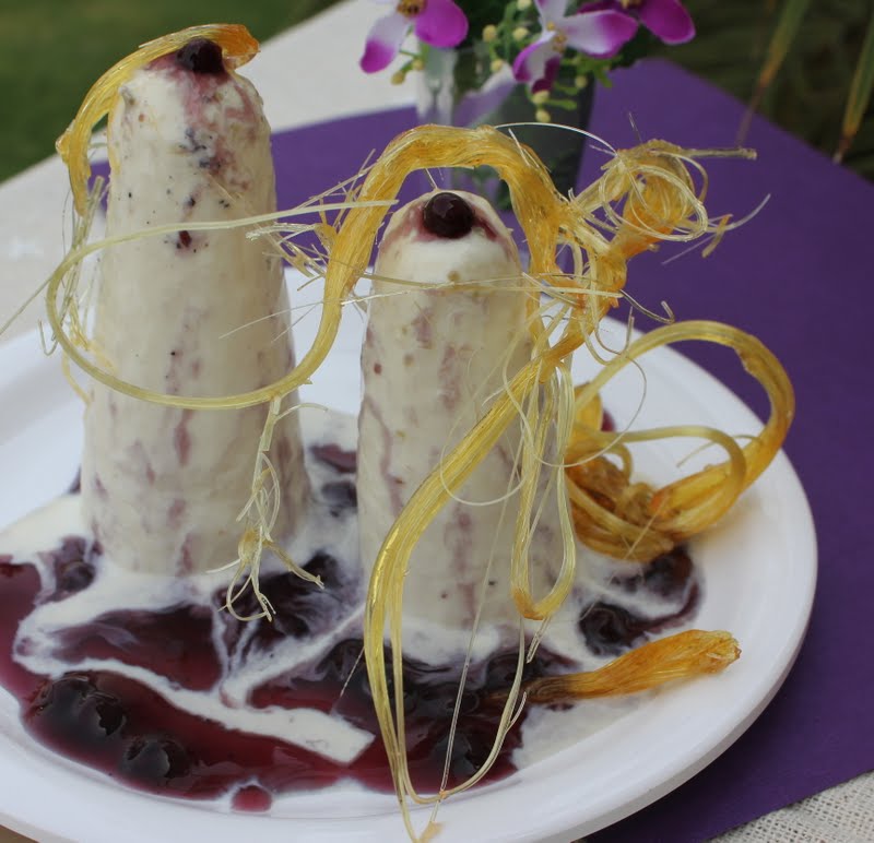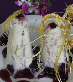 I wanted to serve this kulfi in a different style ,kind of fusion ,so I made blueberry sauce and some sugar strands.You could serve this as it is or with a sauce of your choice,or even with falooda!!