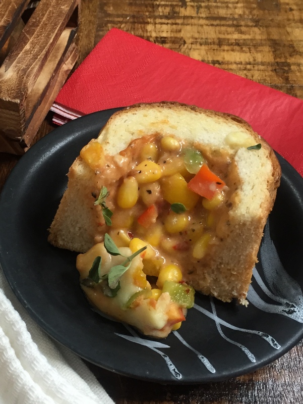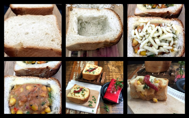 It was on FB that my DIL saw a video, where a loaf was filled with various meats and eggs and baked. She suggested me to try the vegetarian version. My son came up with the option of pink sauce , and I knew I would add corn and capsicum to it. So the vegetarian version evolved and I made this loaf. After slicing the loaf the sauce oozed out and it reminded me of the Lava Cake, hence I named it Lava Loaf Sandwich.