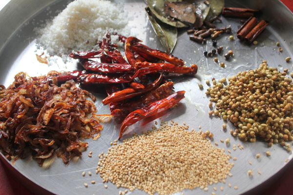 Dry roast the coconut, sesame seeds, separately till pinkish brown.