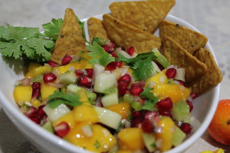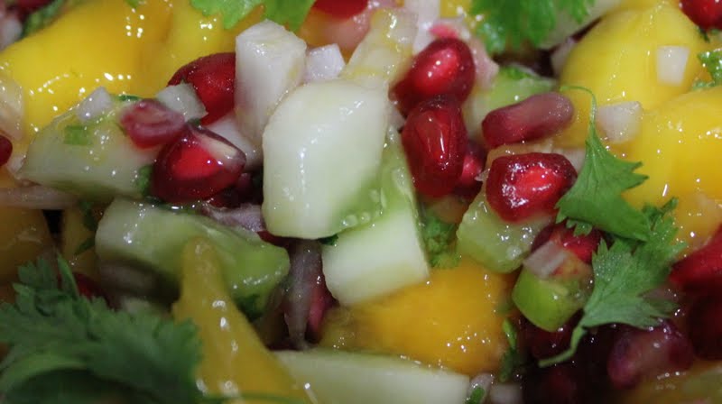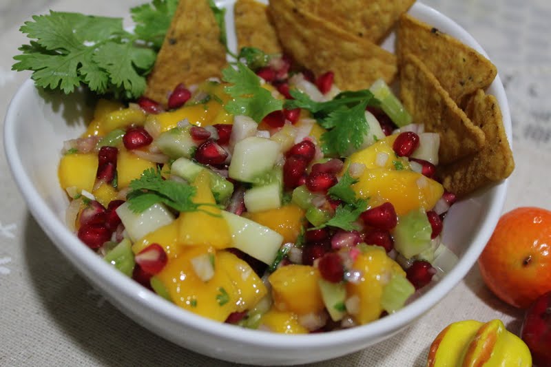 Coming back to Blog Hop…Rajani of My Kitchen Trials.was my pair for the first week..so sweet of her to make the Tawa Sabzi from my blog,and she has done a wonderful job!!,,,to be fair to my co blogger I am posting this delicious Mango Salad from her blog.Actually I was carried away by quite a few recipes on her blog..but I chose this as it’s one of my favorite salads…made a little variation…added the beautiful red pomegranate pearls ,just to enhance its beauty as well as taste…….