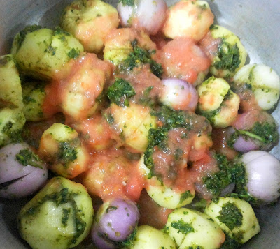 Add potatoes and onions, sauté for a few minutes, add rest of the paste and puréed tomatoes.