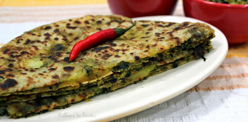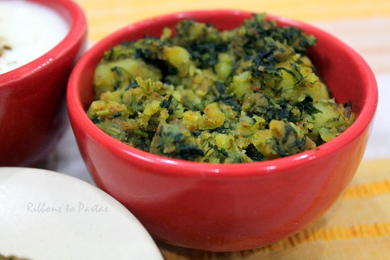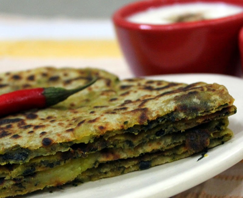 For Day 2 under Methi recipesI have one of my favorite ones. During winters we eat a lot of fresh fenugreek. We have it in many forms, but two of them are made very often. the Ras wara Methi Aaloo is the gravy version, and the dry version is the one I make this Paratha from. Initially when ever we had some left over Methi Aaloo, I would make a Paratha from it, it became such a hit that now everyone wants to eat only Parathas and not the veggie.