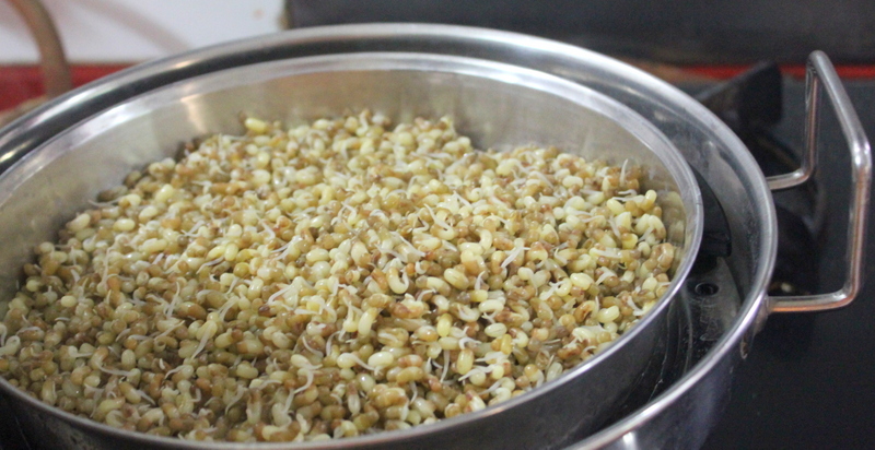 Coming back to missal Pav, the matki sprouts are steamed and a separate spicy gravy is made which is called Kat.The final dish is sprinkled with farsaan sev or namkeen which is easily available in the market. I have used roasted farsaan to avoid those extra calories, but feel free to use the fried one, it surely will taste better.
