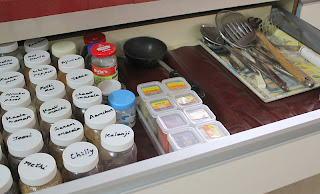 The draw below the main counter with everyday spices .These are labelled for easy access and since they are labelled I get to know as to what has to be refilled.
