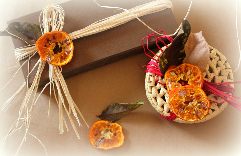 So pick up your old rustic boxes , cane boxes, tie them with raffia adorn them with dried leaves from the garden and a slice of dried orange or lemon .