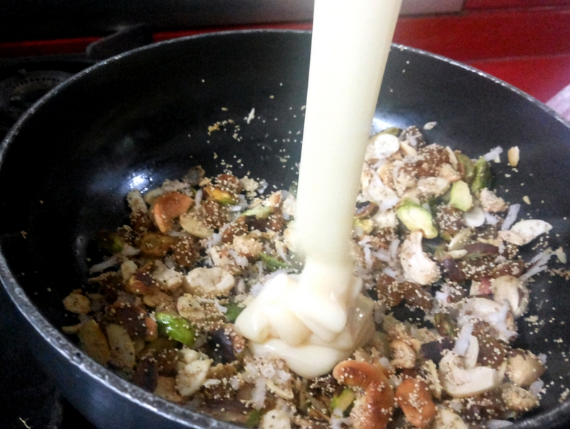 Mix the above with half a tin of condensed milk and keep aside. Taste to check the level of sweetness. Add more condensed milk if required.