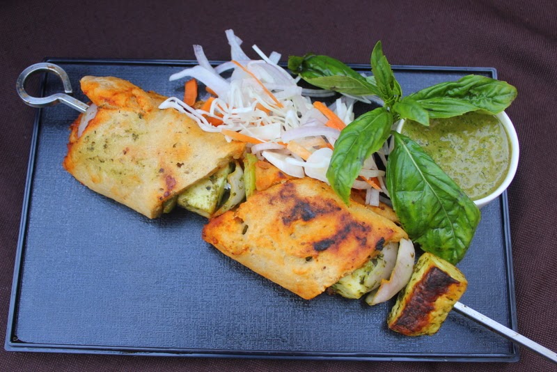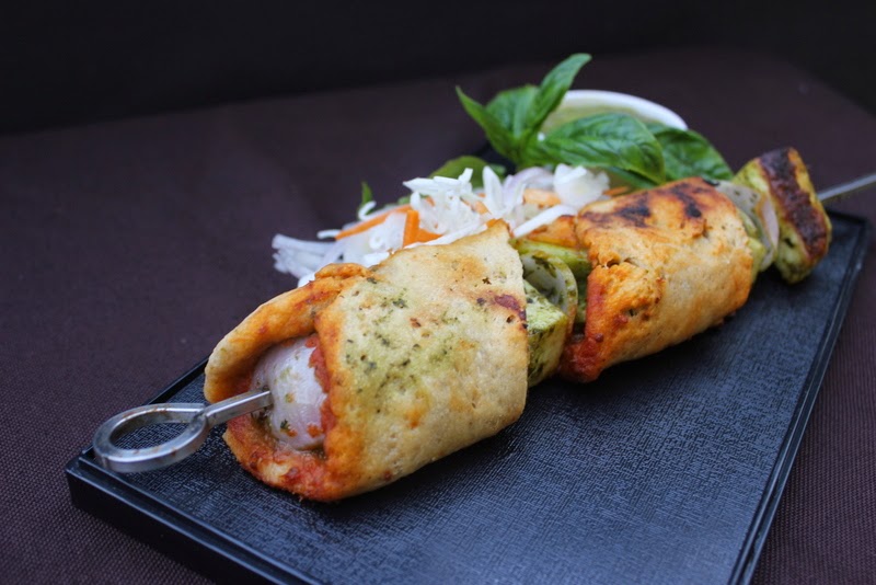 Next day while cooking my evening meal, I gazed at the open refrigerator and saw capsicum and cottage cheese. I knew what I had to cook. I quickly marinated the paneer , capsicums and onion for Tikka. After marinating these for about 30 minutes I stringed these into the skewers. I rolled the left over pizza dough, applied some purée to it and wrapped this over the tikkas, and put them to bake.