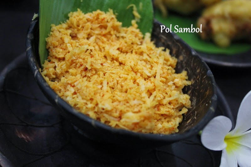 Pol Sambol is a traditional dish from Sri Lanka. It is made with fresh coconuts and is served as an accompaniment with rice, hoppers and most of the meals. It is very simple to prepare. All ingredients are added and given a good massage. Yes the mixing has to be with hands , then only the flavours will seep in. A simple sambol, but very delicious.