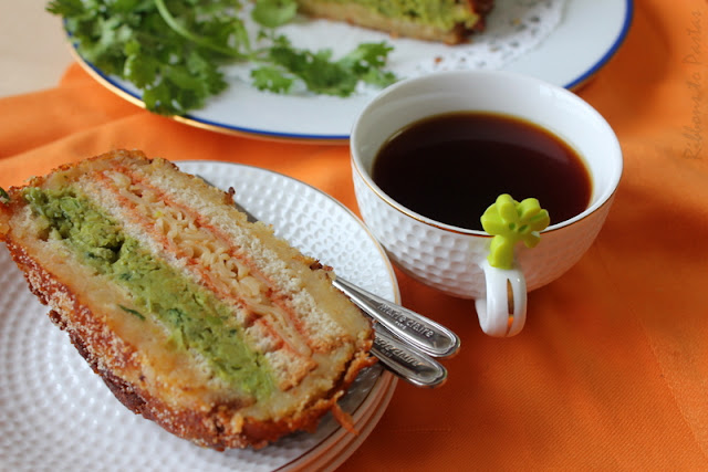 The recipe is made with three slices of bread, make sure you take a small sized bread. The fillings could be your choice but traditionally we use fresh green peas and green chutney for one filling and ketchup and macaroni for the second. After filling the layers the complete sandwich is coated with potato mixture and then deep fried.This becomes like a monster sandwich to be fried and it is rather tricky to fry . One has to be really careful. Actually we can bake it too, wonder why I have never thought of it before. Anyway this is a fried version, if you try the baked version do let me know how it turns out.