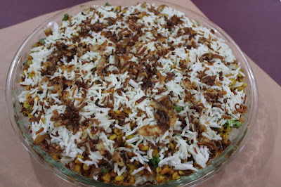 Qubooli is a lentil biryani from Hyderabad , the city of nawabs.Unlike other biryanis, which have veggies or some kind of meat in them this is a unique one with just lentils.The chana daal simmered with yogurt ,spiced with green chillies and spices ,makes a delicious layering for the rice.The rice have their own flavor as they are cooked with whole spices.The fried onions gives that wonderful crunch and lastly the saffron …lends a fantastic aroma …….All put together one really does’nt need a side dish but surely you could serve it with some kind of raita or yogurt.