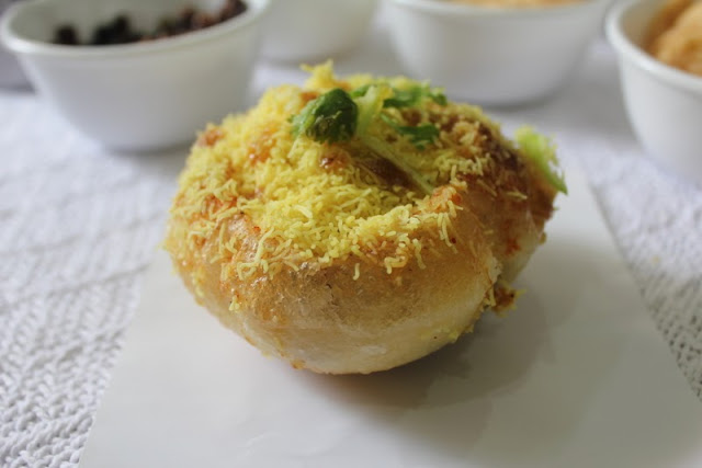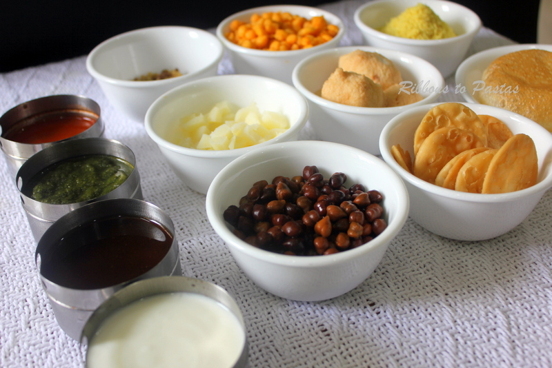 Raj Kachori is like a giant pani puri and is well puffed and very crisp.The trick with it is that you have to adjust the flame every now and then so you can get a real crisp one.Of course if it does not puff..you cannot fill, but one can use it for papadi. The kachoris can be made in advance, just that they should be stored well.We have a number of fillings which again are simple to gather, except for dahi wada which one has to make,It is strange that I do not have the recipe for dahi wadas on my blog, though I must have made them umpteen times.These are the regular udad daal dahi wadas that we make. Papdi , sev, boondi are all store bought.