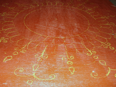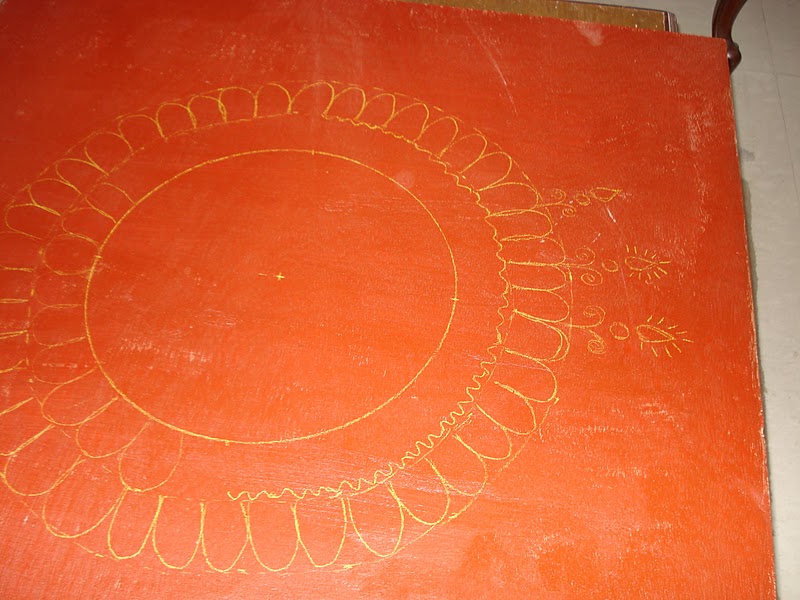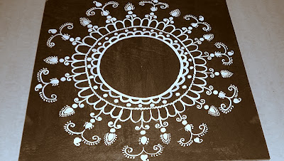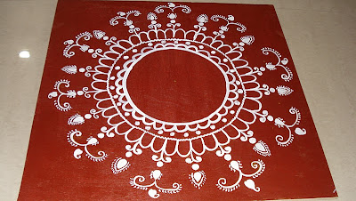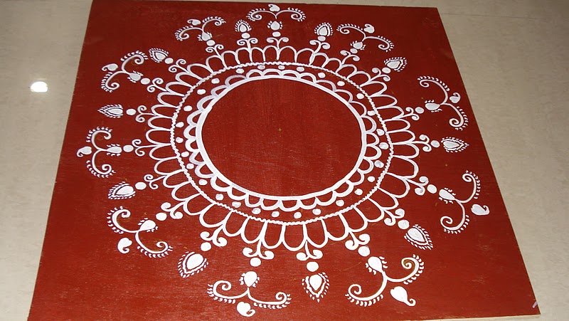 I have taken a square peice of thick plywood,painted with Terracota color,and then made the design with chalk.