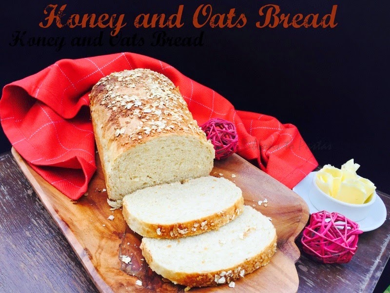 Honey and oats is the bread that I always choose when ordering a Subway, so somehow it pulled me. Also I knew if I would add oats to the bread my family will eat without asking too many questions. When I said Honey and Oats Bread, no one asked if I had used APF. I was happy that the bread was welcome and everyone enjoyed it. My hubby was the first one to taste , early morning with his tea and he loved it, my son, who as you all know is my biggest critic loved it and found the texture and flavor ,both very good. The most interesting part is that I had not read the complete recipe and proceeded. When it was time to bake, i realized that I had to place some water in another pan while the bread was baking. Now , I was worked up, and asked my son, if I should? Some how anything new with breads makes me nervous, and had I read that before I might have opted for another recipe. Anyway I placed the bowl of water and like I told you before that the bread turned out very well. The steam generated from the water made the bread moist . Now let’s come to the recipe…