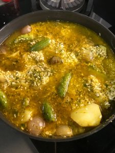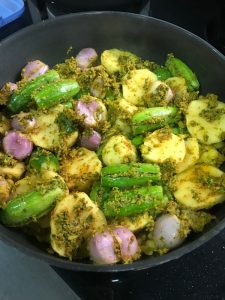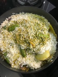 Layered Khichadi is cooked in a heavy bottom vessel . We need to semi cook the lentils first , then place the stuffed vegetables over them . Adding hot water helps In maintaining the cooking temperature and reduces the cooking time . Once the vegetables are semi cooked the rice is spread evenly over the vegetables . Any left over stuffing could be placed on top of the vegetables. Again hot water is added . Make sure to cover and cook the Khichadi on a slow flame , better still place a griddle below the pot for even distribution of heat .