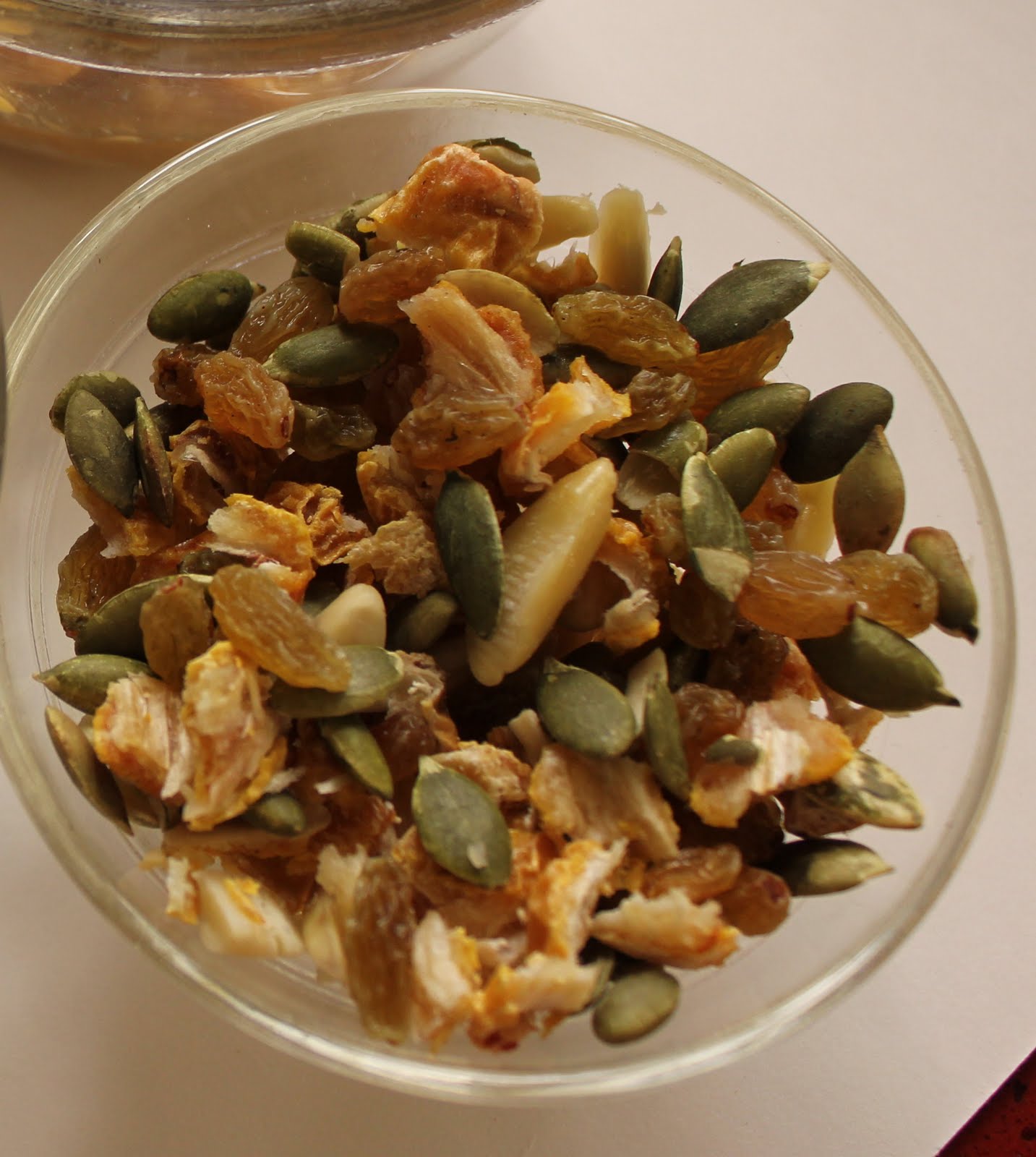 Now add the raisins, almonds, dates and seeds.