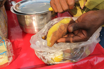 Shakkargandhi, is sweet potato…and this is a chaat which is very famous in North India.Sweet Potatoes are roasted on coal and peeled, chopped and after adding spices drizzled with lemon juice.Its simple to prepare this , once the roasting is done.These can be baked as well as boiled ..One patta / plate of this chaat and you are done!.The masala that these vendors sprinkle varies, but the basic taste does not change.