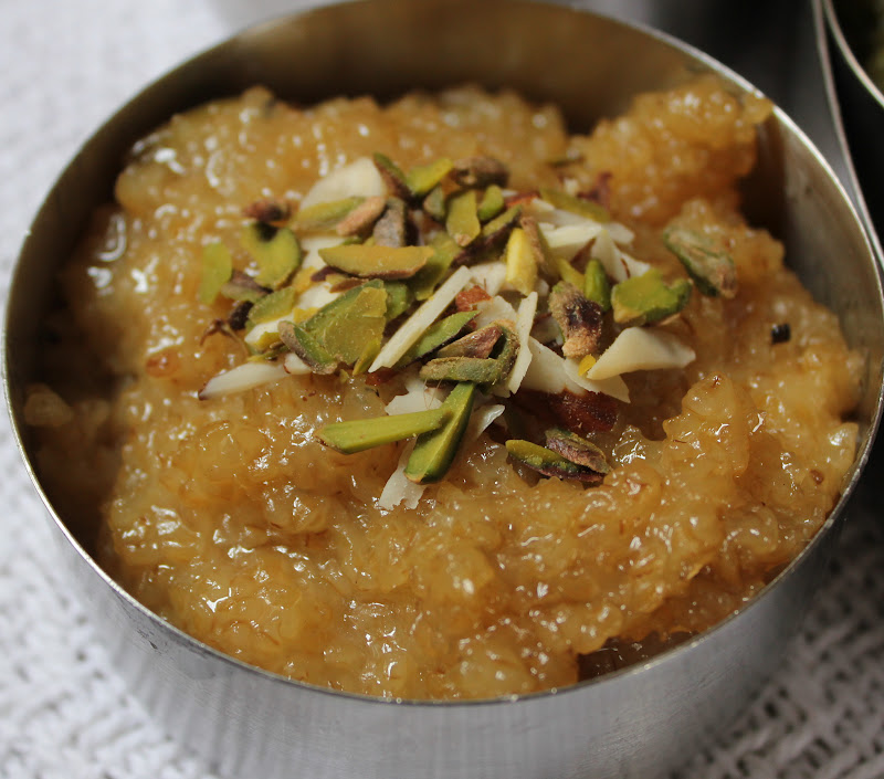 (broken wheat halwa cooked in pure ghee and garnished wih nuts)