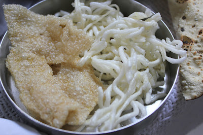 No Sindhi meal is complete without the Sindhi papad.Infact they are served on all meals,be it breakfast ,lunch or dinner.Its supposed to be a blotting paper,which absorbs all the oil…The rice papads are called kheecha and singar is the other version of rice papads which are made from sev press.