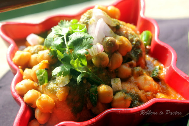 Any way this chola is made in a different style , it has more gravy and the gravy is rather runny.The dabbal or the bread is broken into pieces and then the patty or chaap as we call is also broken and placed on the bread. The chola with gravy are poured on top. The runny gravy is absorbed by the bread thus making it soft.a mint chutney with tamarind, which is also runny is lavishly drizzled on top.This gives the dish a very nice minty, tarty flavor.This chutney is spicy too.The dish is finally garnished with chopped onions and chopped fried green chillies.