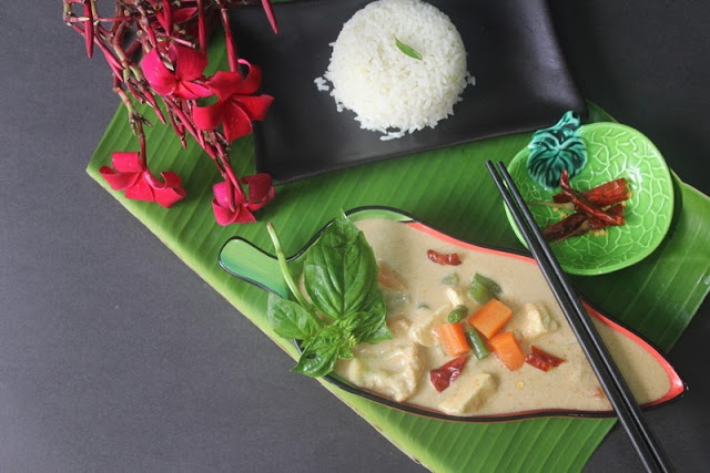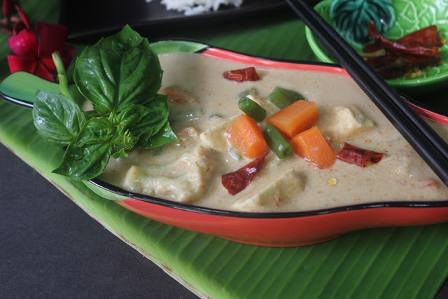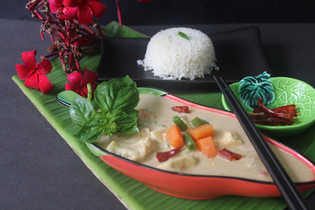 Week 2 begins and for this week I have picked Main Course as the theme .When we say Main Course , it gives you such a wide variety.It was rather difficult to choose, but I have tried to put together some mini platters for the coming two days.For today it is Thai Food.Thai food is one of my son’s favorite food, it’s light and if one has the ready paste and ready coconut milk, it is such a quick affair.